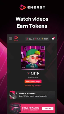 The Energy Area is a highly experimental #Watch2Earn game centered around Nerd NFTs. Users can watch videos to earn Energy Tokens and XP, and battle against each other to upgrade their Nerds to the max level.